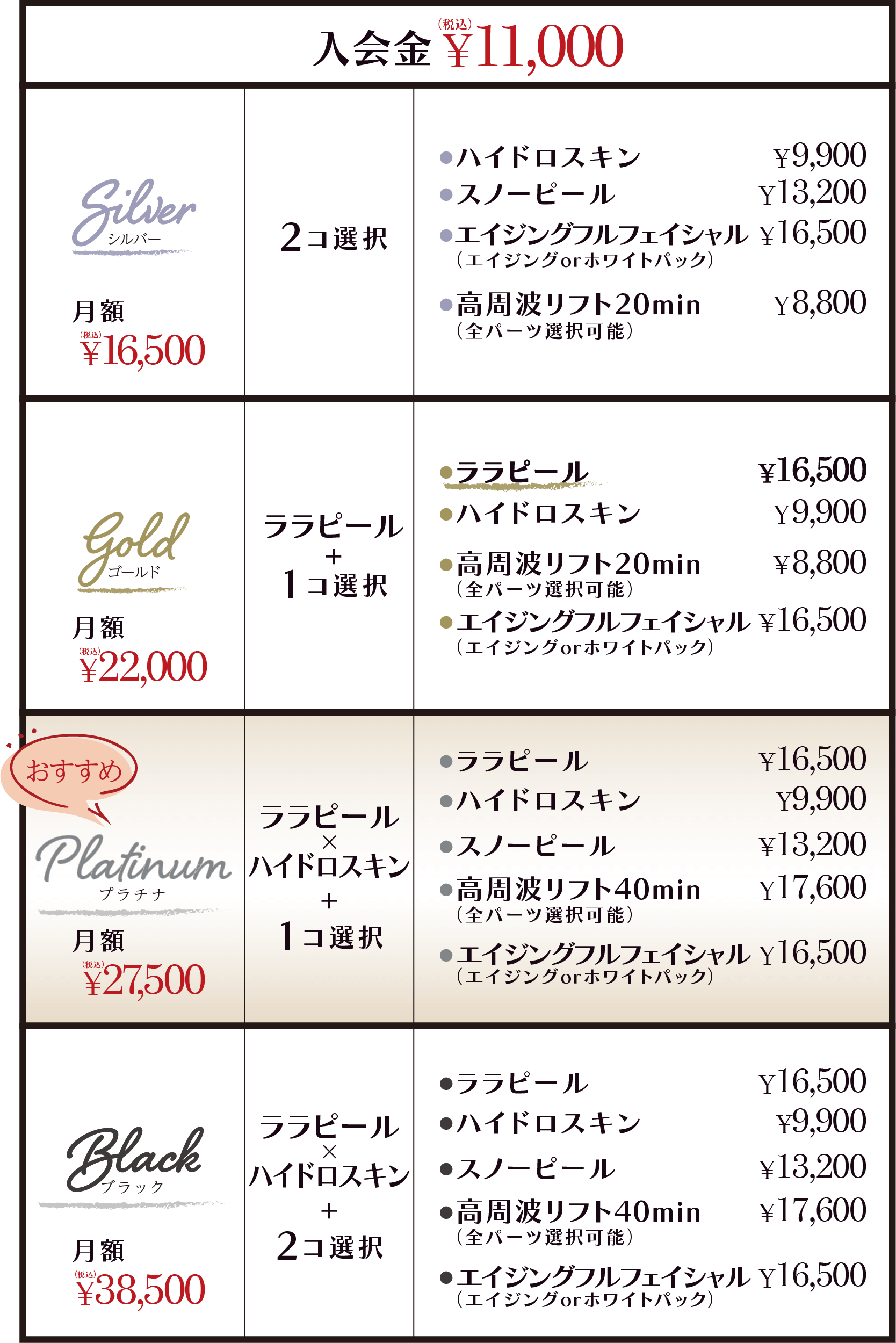 美容の時間をライフスタイルにしやすく、施術ペースも1〜2か月に1回のご来店でも大丈夫♪気分や体調・お肌の状態に合わせてセレクトできるから、エステ通いが続かない方にもお勧め!サブスクは、月額16,500円(税込)~38,500円(税込)までの5種類をご用意。セルフエステ並みのリーズナブルさも魅力!