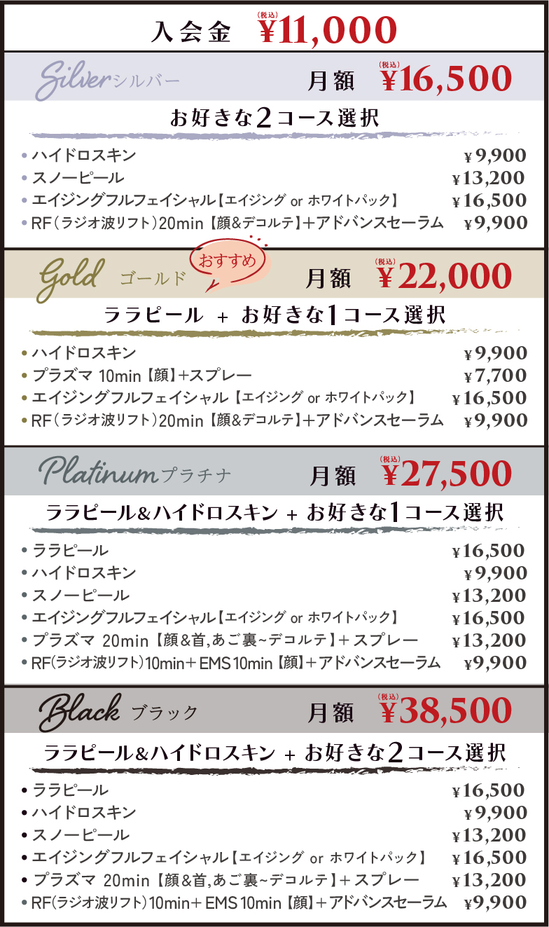 美容の時間をライフスタイルにしやすく、施術ペースも1〜2か月に1回のご来店でも大丈夫♪気分や体調・お肌の状態に合わせてセレクトできるから、エステ通いが続かない方にもお勧め!サブスクは、月額16,500円(税込)~38,500円(税込)までの4種類をご用意。