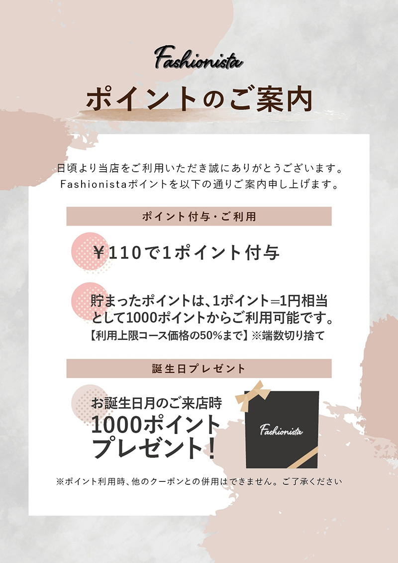 Fashionistaポイントを以下の通りご案内申し上げます。