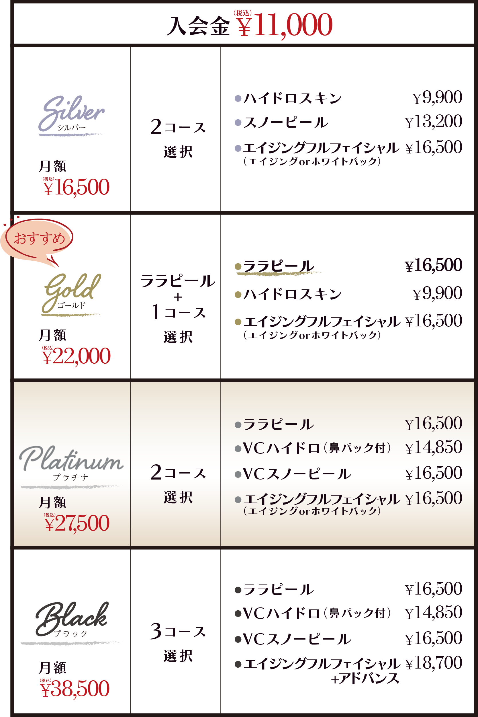 美容の時間をライフスタイルにしやすく、施術ペースも1〜2か月に1回のご来店でも大丈夫♪気分や体調・お肌の状態に合わせてセレクトできるから、エステ通いが続かない方にもお勧め!サブスクは、月額16,500円(税込)~38,500円(税込)までの4種類をご用意。